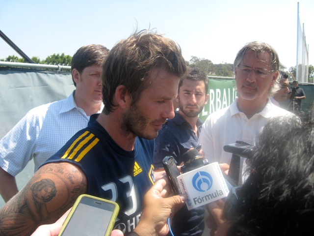 Following a twenty-minute warm-up the rest of the Galaxy split into two sides for a scrimmage game while Beckham worked on his own with a trainer. At the training session’s conclusion, Beckham took time to speak to the press about the Galaxy, the World Cup, his future with England and other matters.
