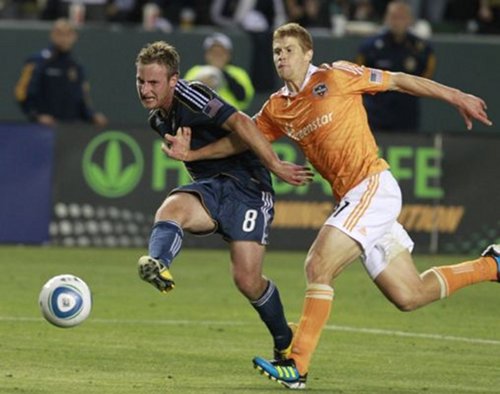 (Carson, CA) – Landon Donovan created a little breathing room for himself at the top of the Major League Soccer top scorer table. The Galaxy captain’s coolly converted penalty kick was the only goal scored in a somewhat drudgerous midweek encounter between the LA Galaxy (7-2-5) and the Houston Dynamo. The 46th goal brought Donovan’s season tally to eight, which puts him two above DC United’s Charlie Davies and one above his own tally from last season.