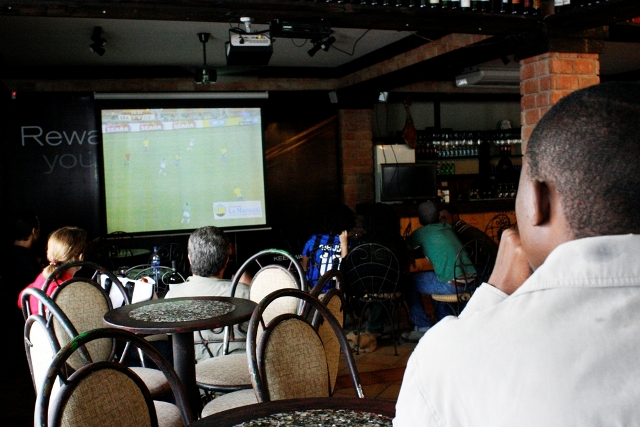 The patrons watching the Brazil-Ivory coast game at the Viejo Jack have a more passive, refined dedication to the game than the students at Los Padres. They order Vat 69 and Jack Daniels whisky and sip Chilean white wine in a country where most people quench their thirst with $5 liters of rum.